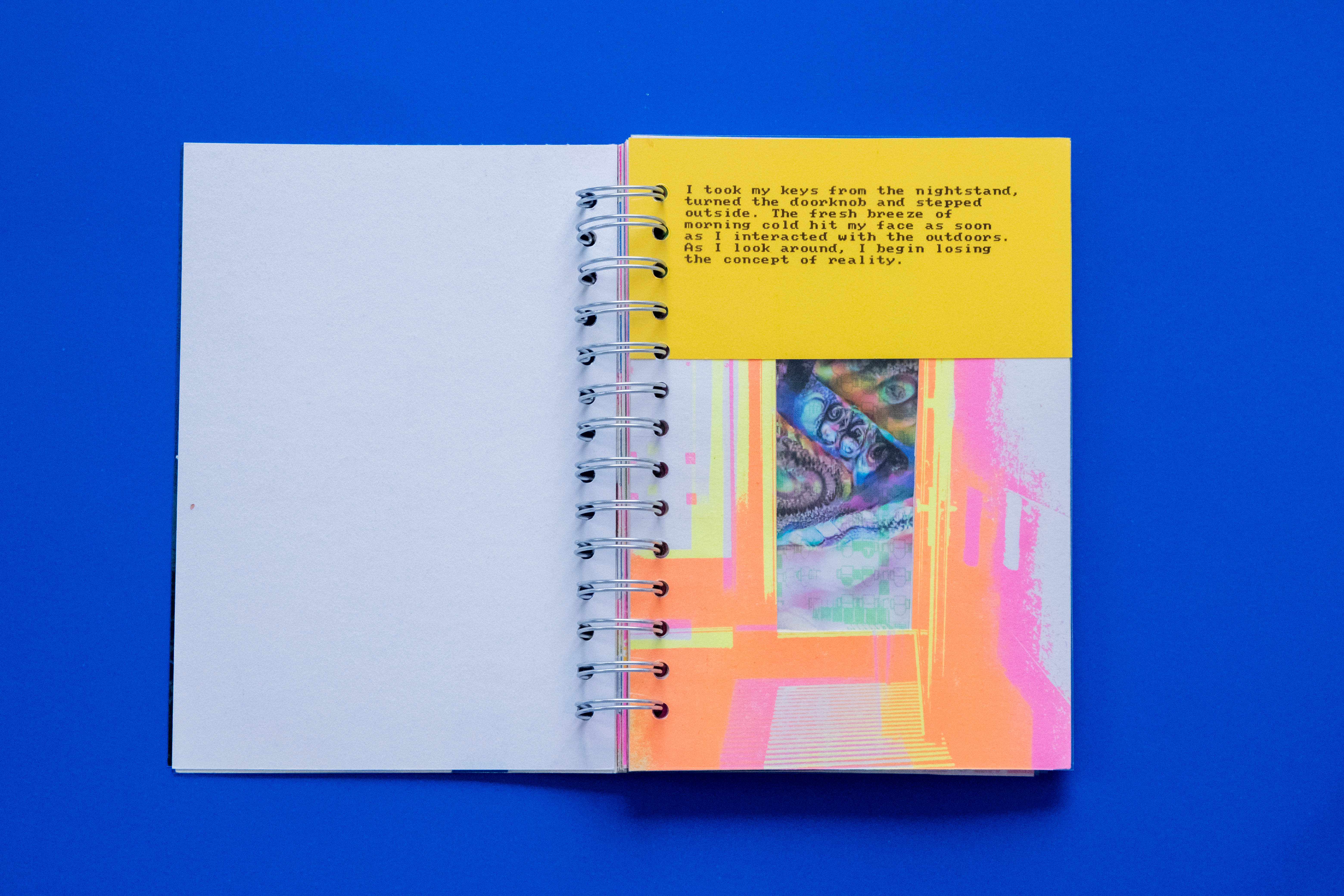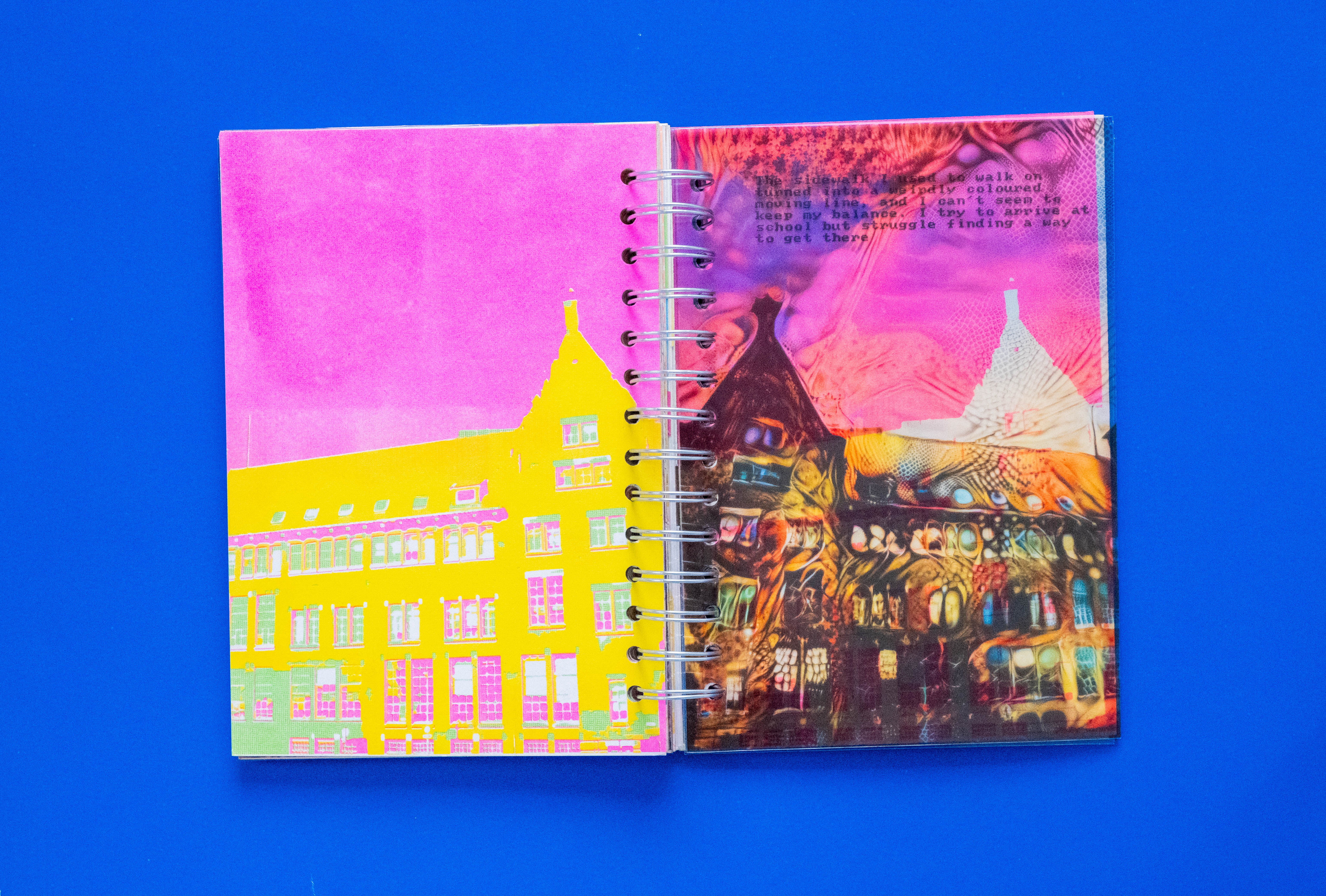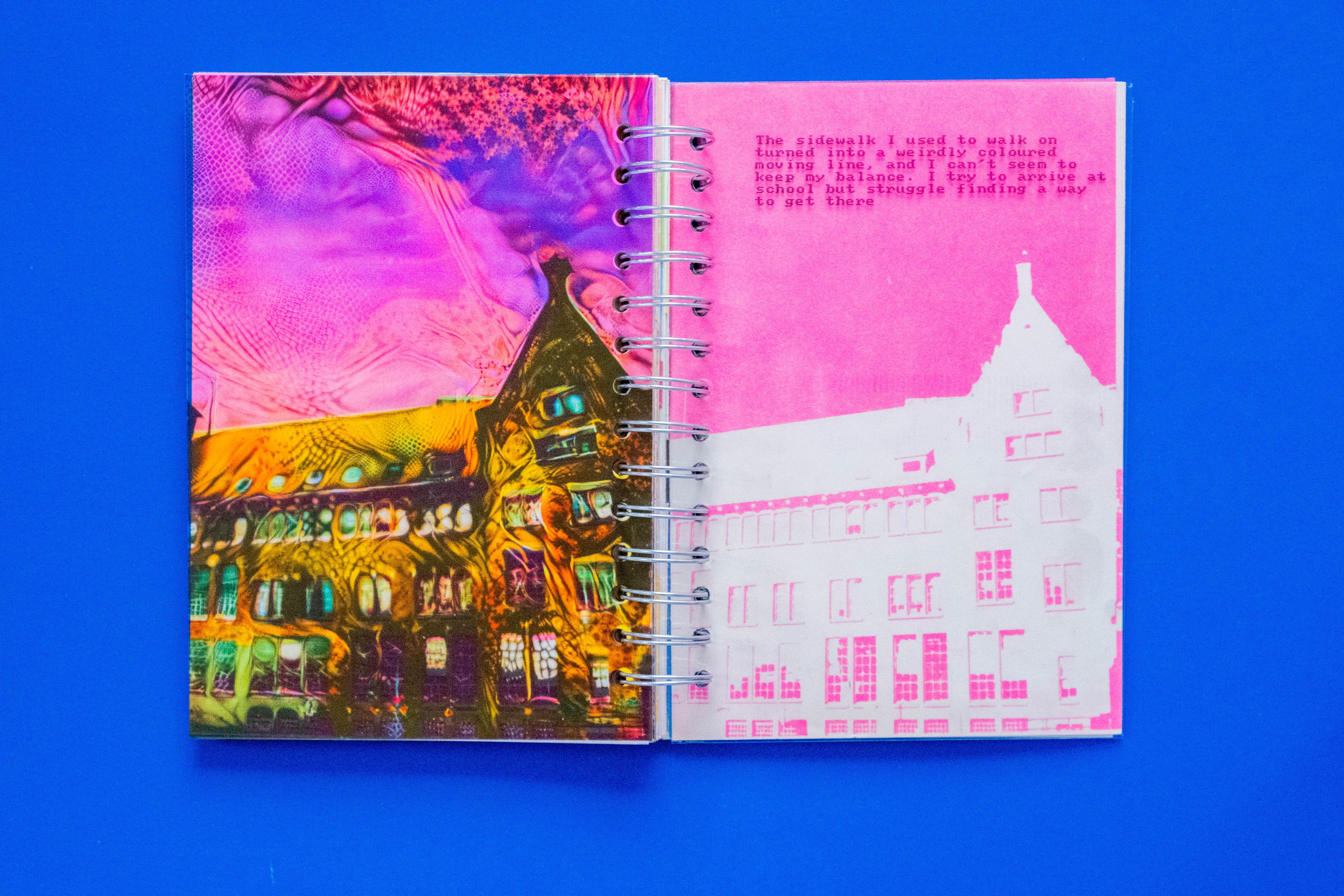 I experimented with analog techniques, using Risograph printing to create visuals with a unique, textural feel, adding dimension and an extra layer of psychedelia to the narrative. The final book blended storytelling and Risograph printing into one visually striking piece, capturing the surreal and disorienting essence of the journey.