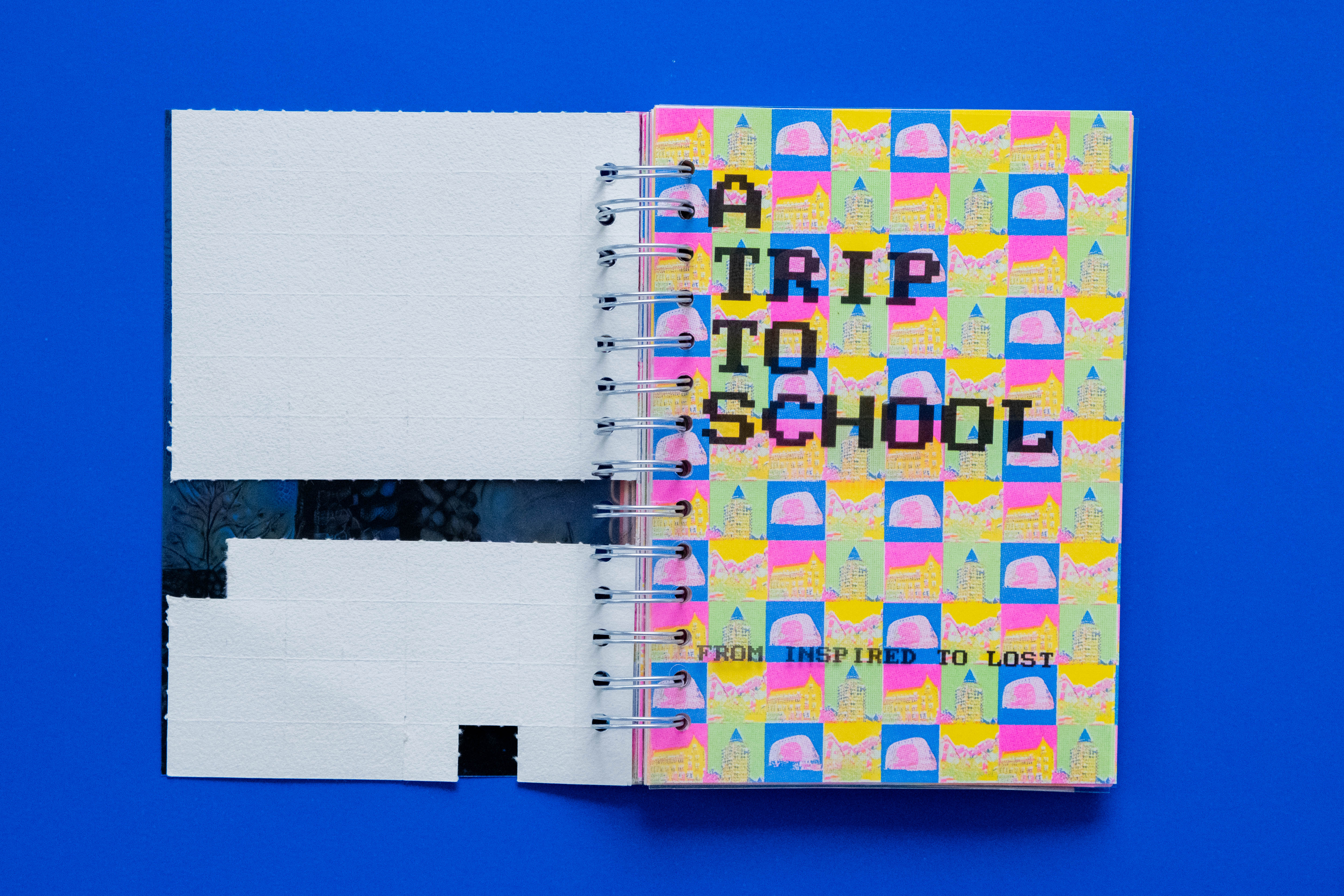 The project involved writing a story about my trip to school and visualizing it as a book. The story took a surreal turn, with the character embarking on a literal "trip" to school after forgetting she had taken drugs.