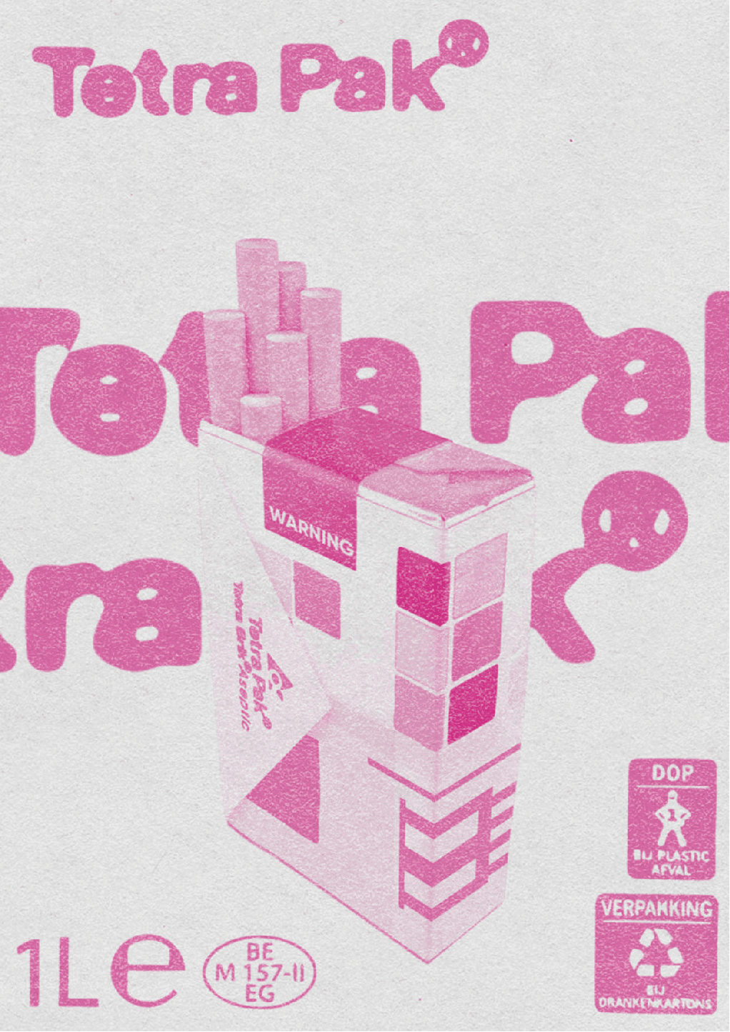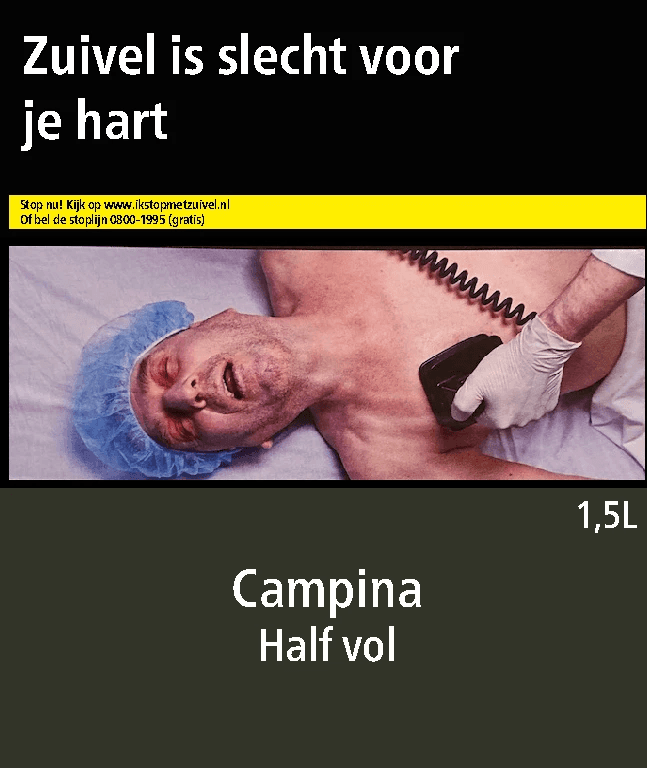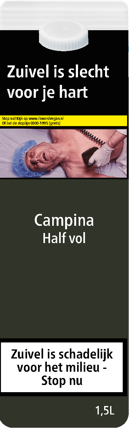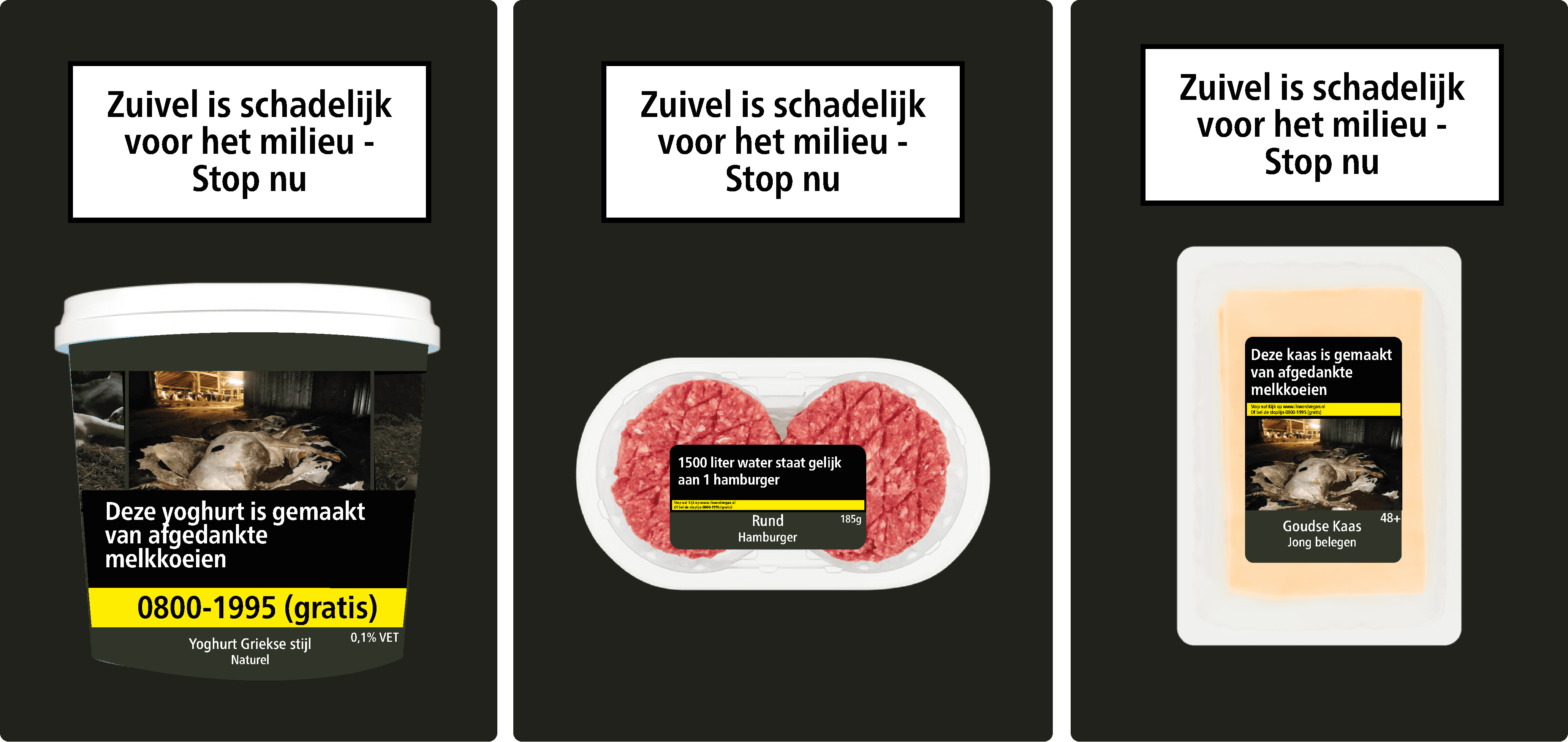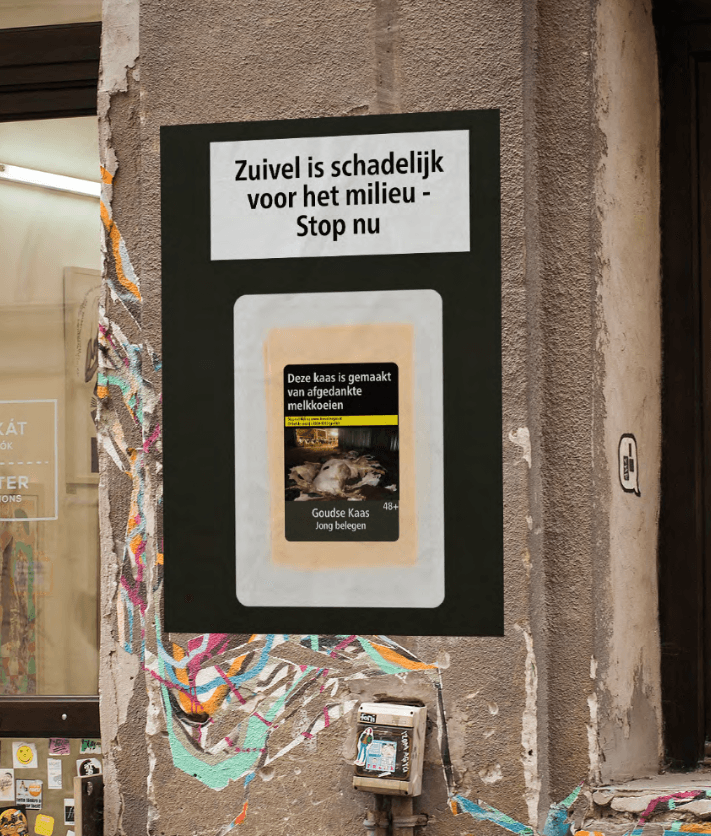 This evolved into a deeper critique of adding cigarette-style warnings on the milk packaging to draw attention to negative things from the dairy industry and later expanded into the meat industry as well. The redesign used bold visuals to make one think of the harm from the dairy and meat industries, turning what had been a simple packaging concept into greater social commentary.